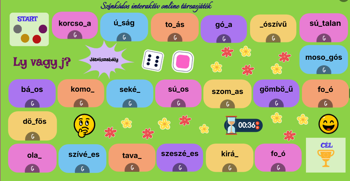 A következő társasjátékot az igeragozás gyakorlásához készítettem. A dobókocka kattintásra forogni kezd. Amennyit mutat a dobókocka, amikor megáll, annyit lehet lépni előre. A színes karikák a bábuk, melyek mozgathatóak. A játékosoknak a mezőn szereplő kezdőbetűkkel kell igéket mondaniuk. A színes szívekre kattintva ki lehet választani az igék számát és személyét. Egy ige a játék során csak egyszer szerepelhet. A nap jelre érve egyet előre lehet lépni. A virág jelre érve még egyet lehet dobni. Az órával meghatározható a válaszadásra felhasználható időkeret.